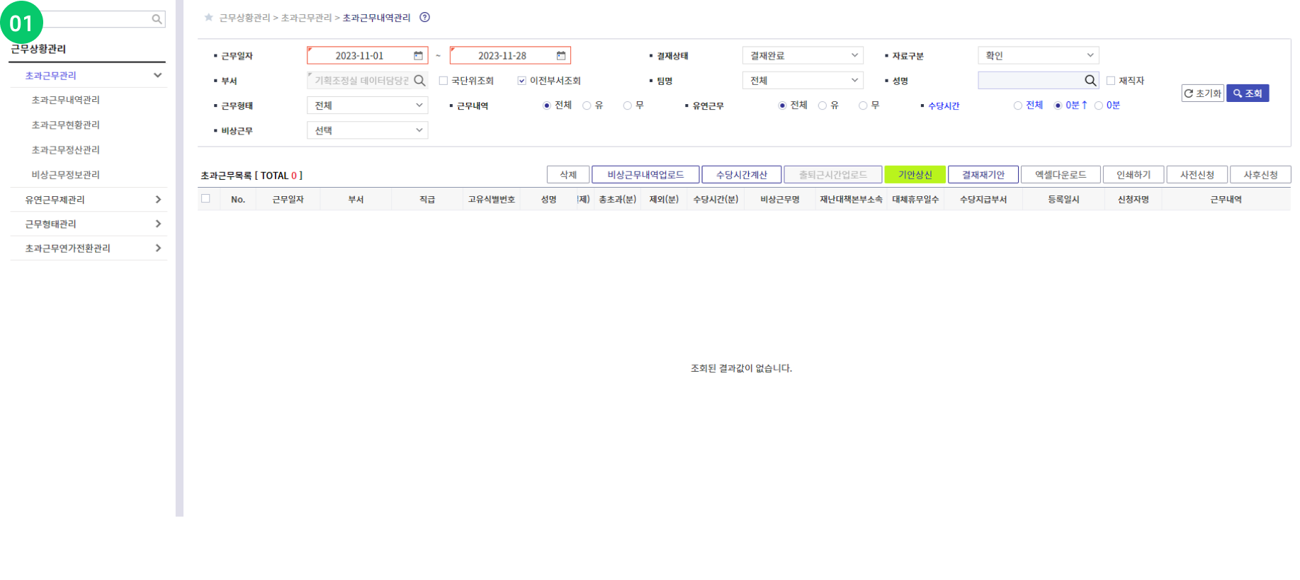 [근무상황관리]-[초과근무관리]-[초과근무내역관리]