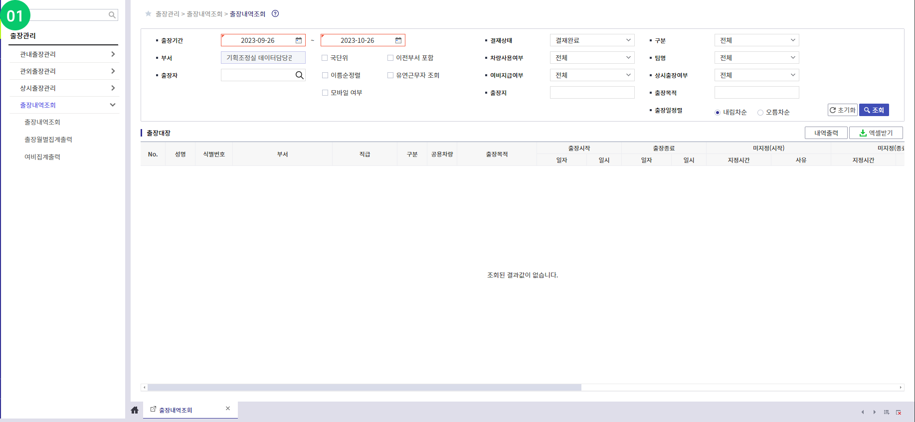 ① 인사랑 > [출장관리] > [출장내역조회] 이동