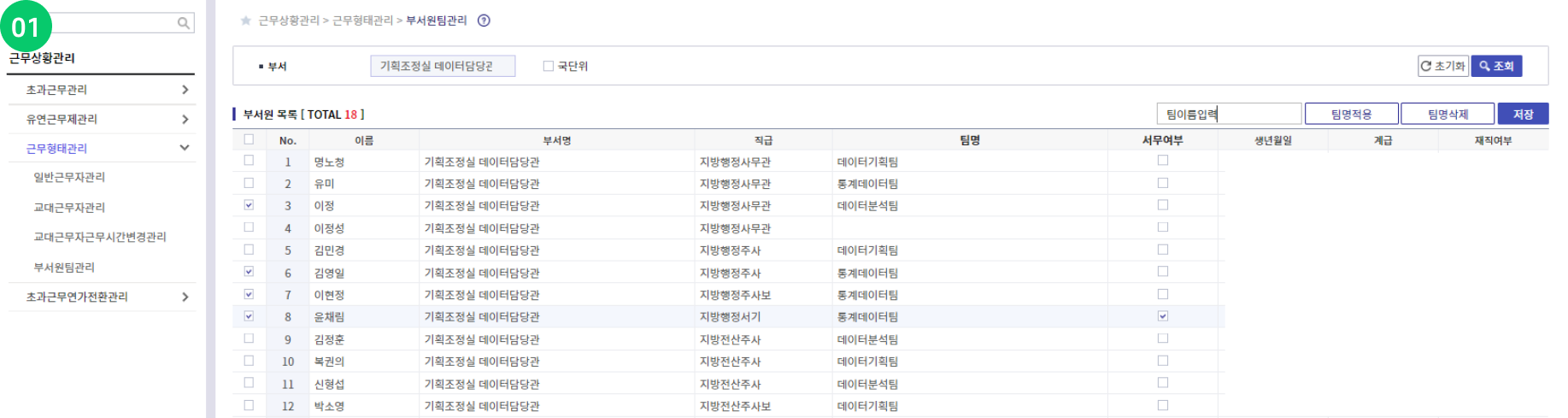 [근무상황관리]-[근무형태관리]-[부서원팀관리]